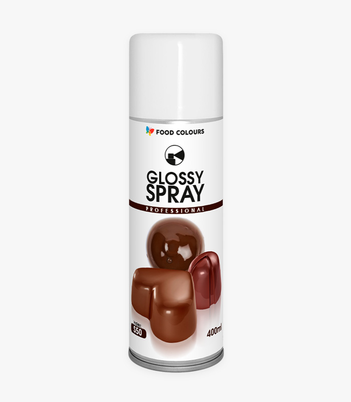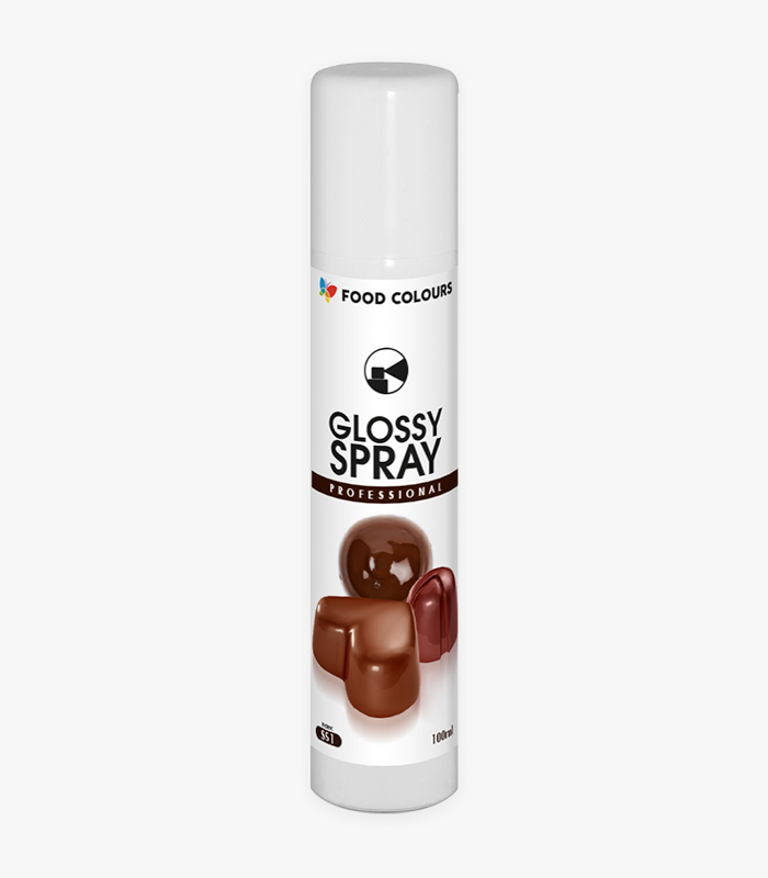 Glossy Spray nadaje lustrzany połysk większym powierzchniom z czekolady, masy cukrowej, marcepanu., izomaltu